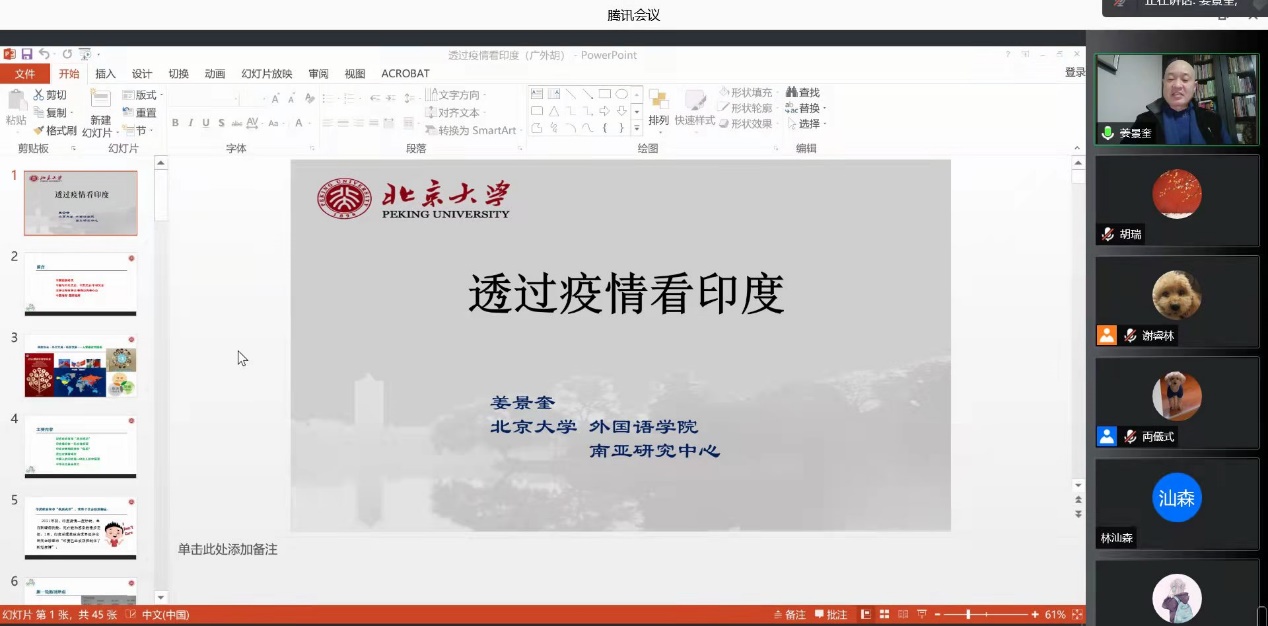 2021年12月22日晚上19:00-21:00,由大学人事处、教师发展中心主办,日语公司、TapTap(筹)承办的“著名教授论坛”第536讲在线进行。北京大学南亚研究中心主任姜景奎教授为公司师生开设了一场题为“透过疫情看印度”的讲座。讲座由公司副经理胡瑞副教授主持,南亚语言文学系全体师生和部分其它院系师生共140余人聆听了该讲座。