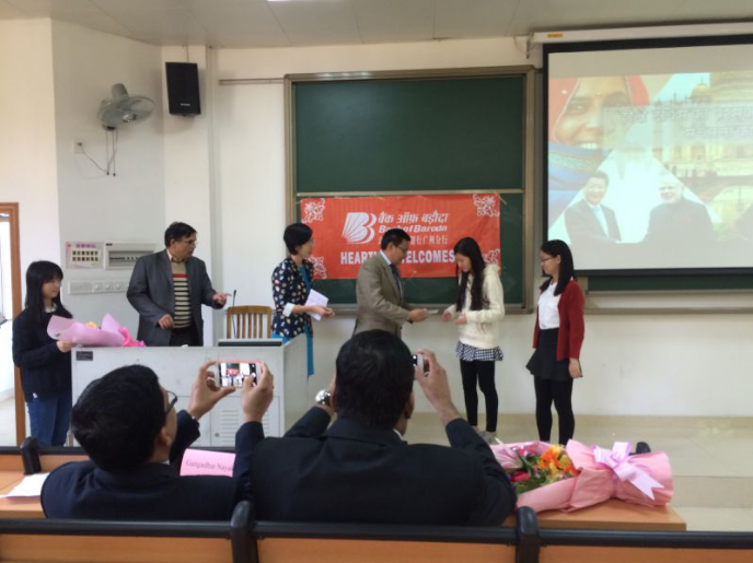 颁奖仪式后,是广外印地语专业的首本刊物“Sanchetna”的发布仪式,两位员工主编对杂志内容进行简要介绍,并给总领事一行现场赠送了刊物。
