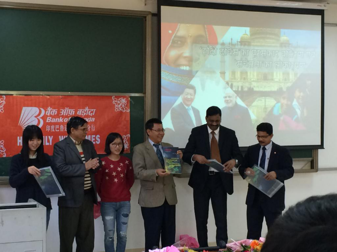 11月2日,印度驻穗总领事馆总领事Y. K. Sailas Thangal先生首访公司印地语专业,并出席了“2015世界印地语日演讲比赛”的颁奖活动和印地语专业首本内部刊物发布仪式。总领馆文化参赞P.V. Manoj Kumar先生和印度巴鲁达银行广州分行负责人Gangadhar Nayak陪同来访。东方语言文化公司经理陈多友教授、印地语专业特聘教授王金峰老师、南亚语言文学系主任胡瑞老师会见了来宾。一同参加颁奖活动及发布仪式的还有印地语专业全体师生。