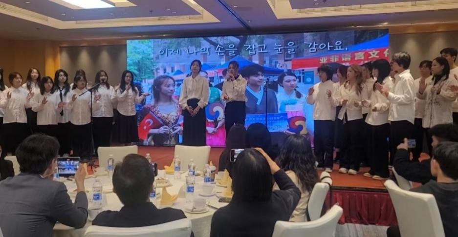 在晚宴上,广外朝鲜语系的同学们带来了精彩的歌唱与朗诵表演。表演中,员工们用中韩双语演唱了中韩民众耳熟能详的民歌,朗诵环节中表达了朝鲜语系学子促进中韩友好交往的期待与决心。充满激情,满载诚意的表演赢得了全场热烈的掌声。