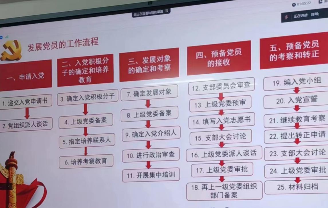 会计公司党委组织员陈瑶老师则从支部工作的“五个一”入手,重点强调了支部工作的主要内容,并向在座师生详细介绍了发展党员工作的流程及要点,入党程序必须严格按照程序和规定进行,要做好入党材料的审查工作,确保每个入党申请者都符合党员标准。