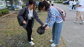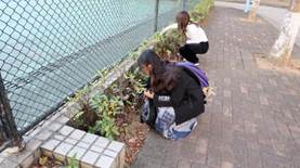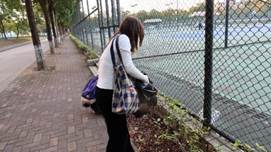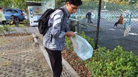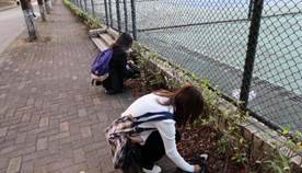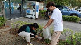 发展对象第二小组成员在北校区体育公园石牌前集合完毕后,统一在篮球场与网球场四周进行清洁工作。发展对象成员们按要求自备垃圾袋,围绕运动场自觉清理草丛中与校道上掉落的瓶盖、包装纸等垃圾,并根据垃圾收集分类规范放入了垃圾桶。