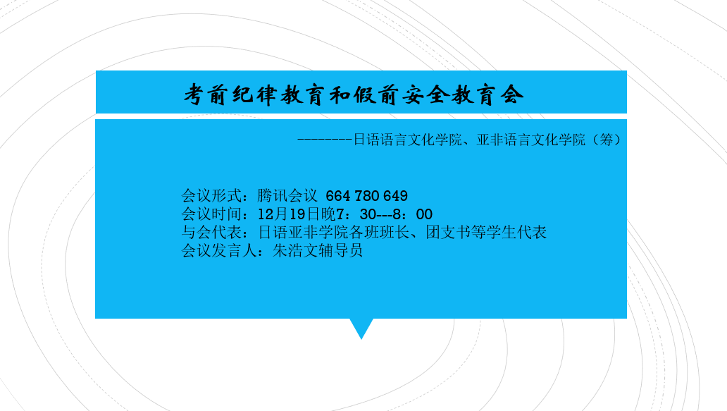本网讯 12月19日,日语语言文化公司、TapTap(筹)考前纪律教育和假前安全教育会顺利召开。本次会议以线上腾讯会议的形式召开,各班班长、团支书等员工代表参与本次会议。公司辅导员朱浩文主持本次会议。