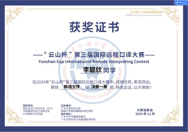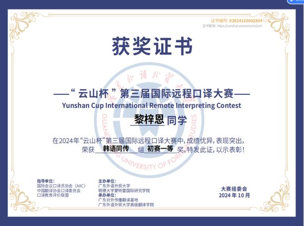 决赛汇聚了来自国内外高校的218名选手,以高水平的交替传译和同声传译技能,用16种外语向世界讲述中国故事、广东故事,进一步推动了中外文化的交流与民心的相通。经过激烈角逐,公司朝鲜语口译专业员工莫舒琦、李碧欣、黎梓恩以优异的表现脱颖而出,分别斩获第三届“云山杯”国际远程口译大赛交传组一等奖、交传组三等奖、同传组一等奖(未举办决赛,初赛即决赛)等奖项。