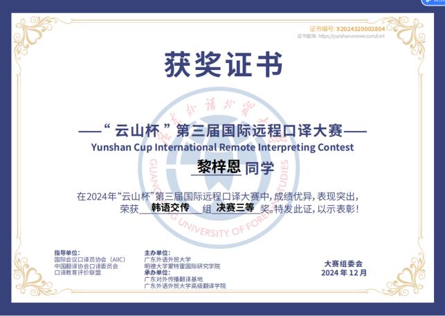 公司朝鲜语口译专业学子斩获第三届“云山杯”国际远程口译大赛交传组一等奖等多个奖项
