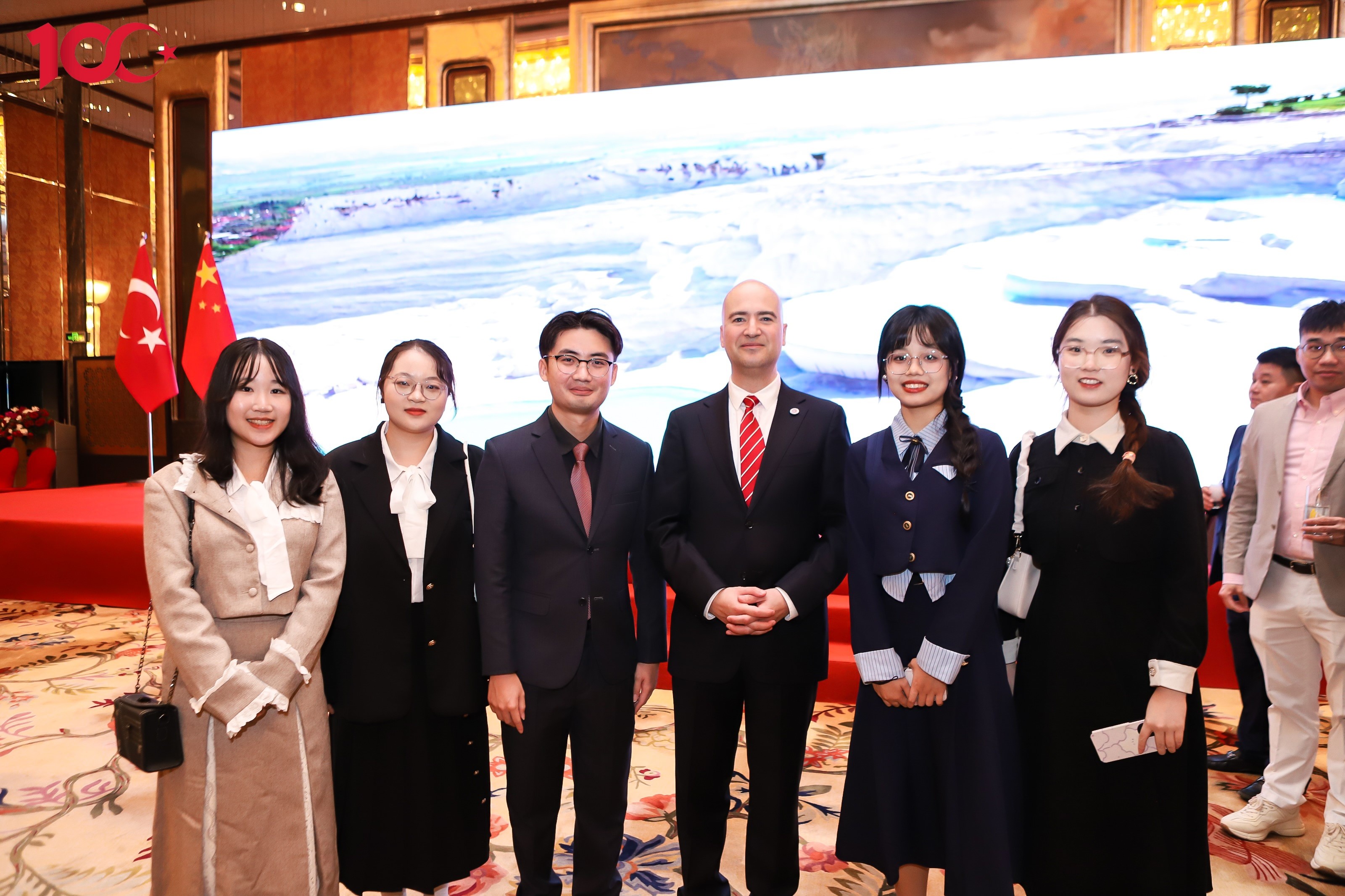 2023年10月30日晚,亚非语言文化公司党委书记梁洁、土耳其语系专业负责人黄嘉玲及教师李诗晴、外教布兰特·奥兹坎、艾察·查拉阳·奥兹坎带领大四年级共11位本科生应邀出席了由土耳其共和国驻广州总领事馆举办的土耳其共和国建国一百周年国庆招待晚宴。