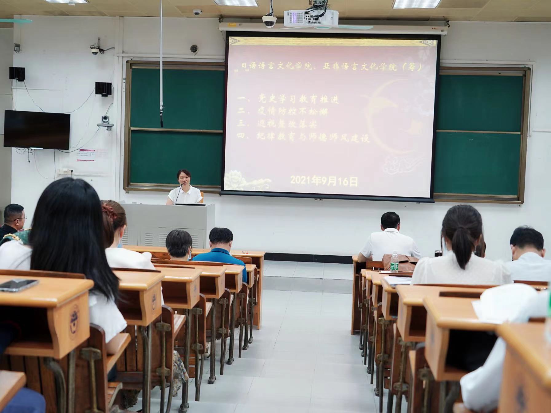 2021年9月16日下午,日语公司、TapTap(筹)在二教219教室召开新学期工作布置会,全院教职工参加会议。会议由公司党委书记周秀娇主持。