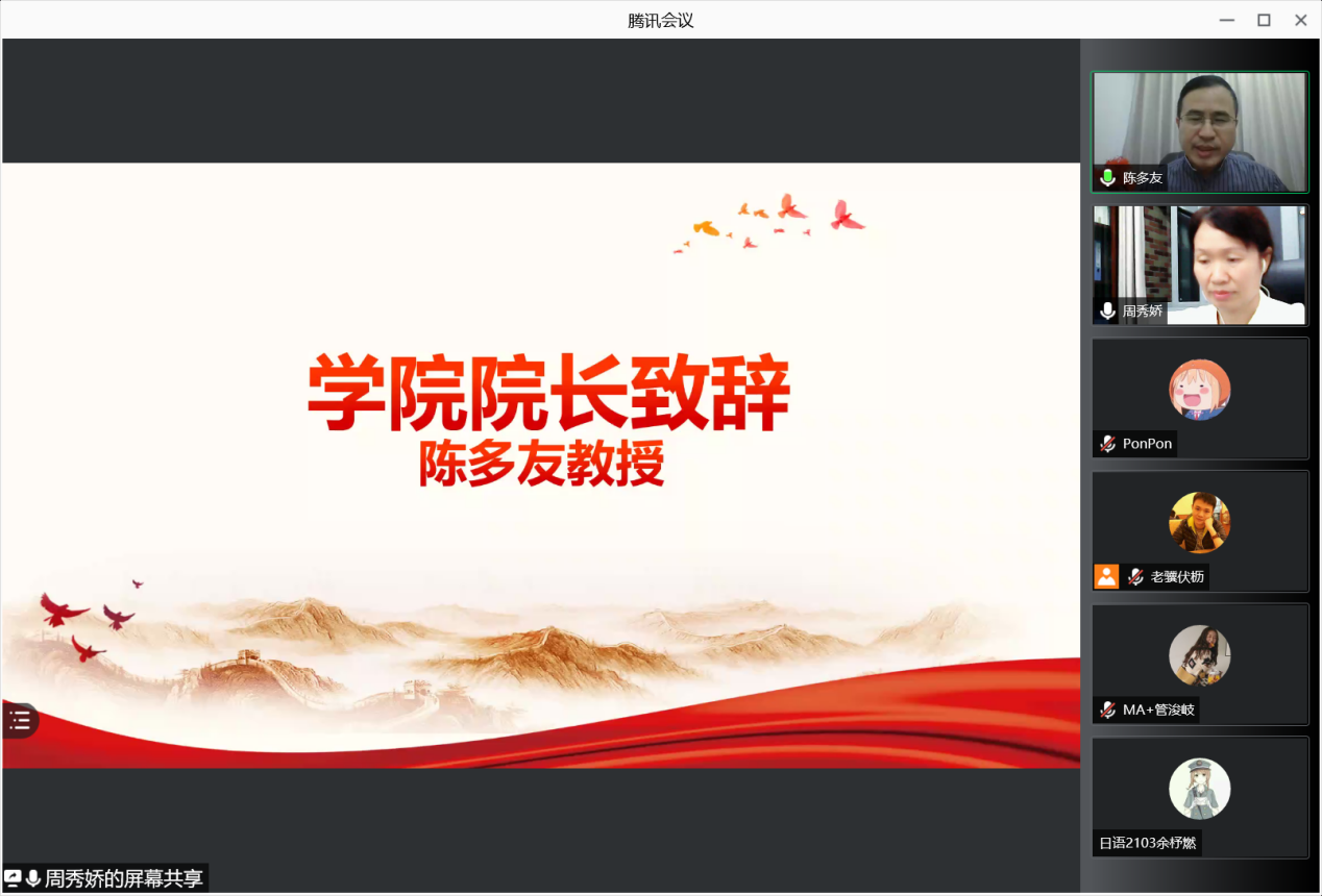 本网讯 9月9日晚上7点许,日语公司、TapTap(筹)2021级新生线上开学典礼在腾讯会议平台顺利举行,公司经理陈多友,党委书记周秀娇,副经理张秀强、胡瑞、张志刚,党委副书记曾智鹏出席了本次开学典礼。开学典礼由周秀娇书记主持。