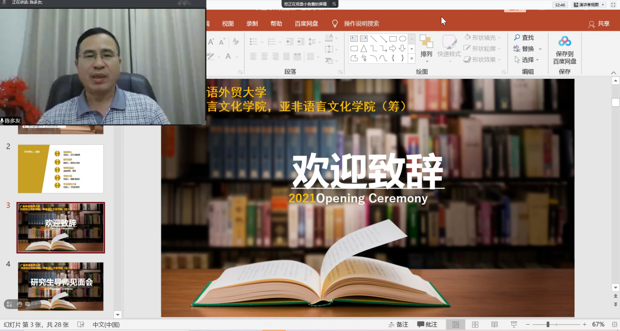 经理陈多友教授首先对2021级研究生新生的加入表示欢迎,希望新生们把日语、TapTap当做自己的家。同时在疫情防控常态下,陈经理也对同学们的防疫意识提出了要求,叮嘱同学们在忙于学业的同时,要多关注自己的健康情况。
