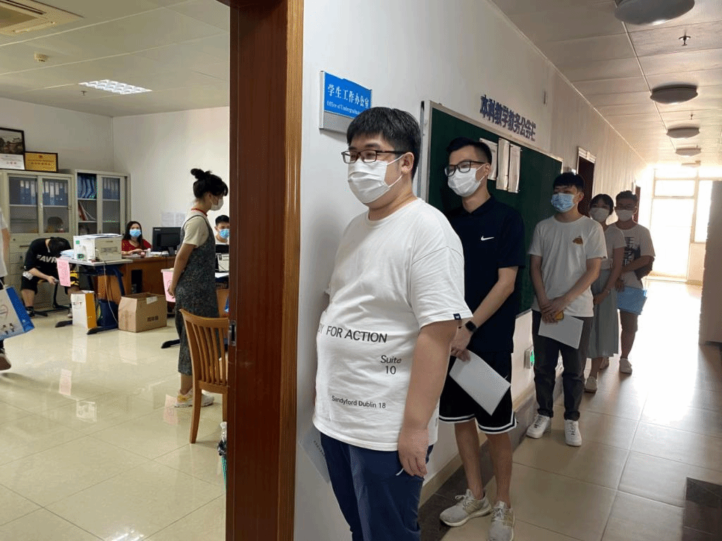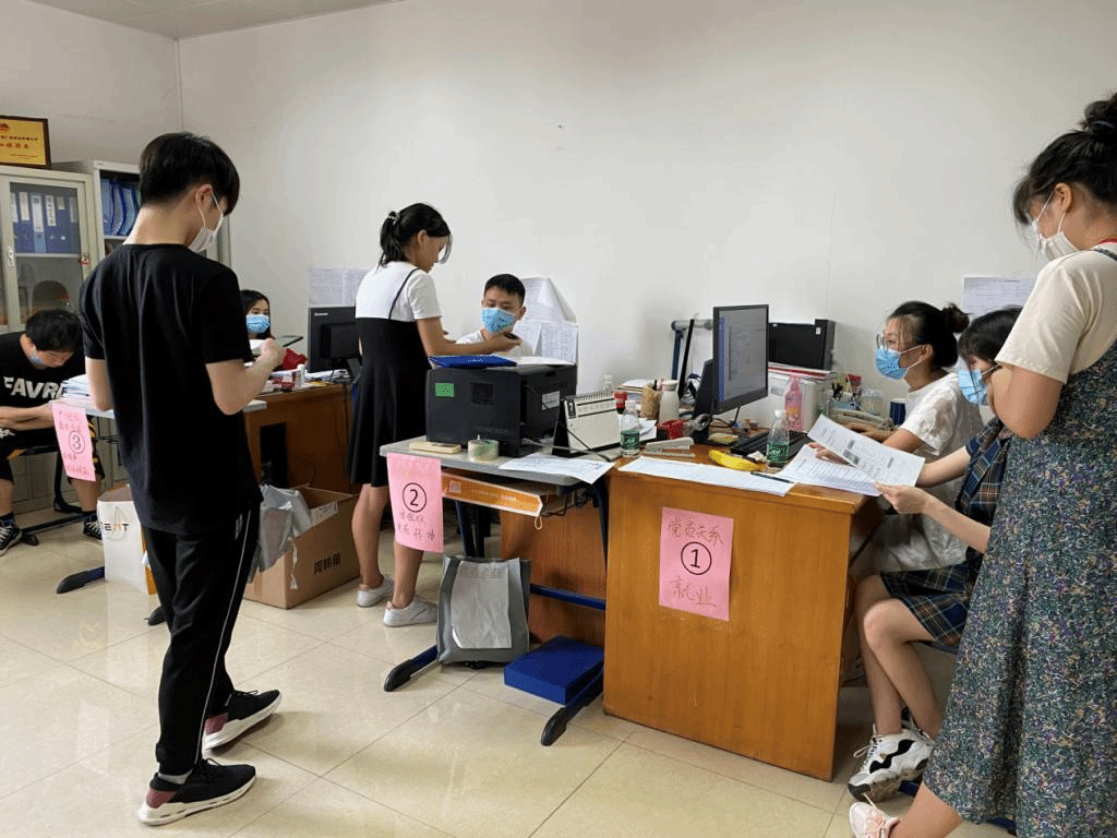 为了方便毕业生办理毕业手续,公司精简了毕业手续流程,为同学们安排了“一条龙”服务。同学们提前准备好资料,并按指引有序进行离校手续确认。在志愿者的协调下,同学们间隔一定的距离在门外排队等候,现场秩序井然。同时公司开放了公司会议室和团学办公室,为尚未准备好资料的同学提供了填写资料的去处。
