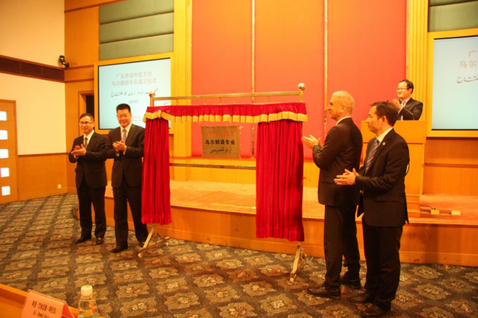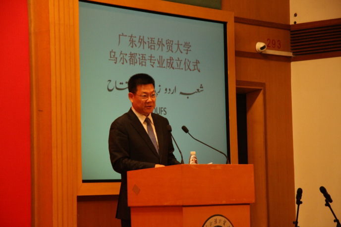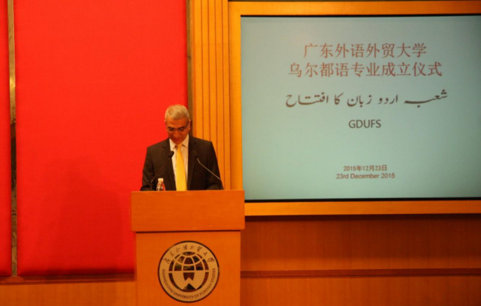 本网讯 12月23日上午,乌尔都语专业成立仪式在北校区行政楼国际会议厅举行。巴基斯坦驻广州总领事阿里·艾哈迈德·阿拉因,副总领事哈山·阿赫塔尔,公司董事长仲伟合,国际合作与交流处处长蔡红,东语公司经理陈多友、党委书记杨敏生等相关领导和全体乌尔都语专业师生参加了该仪式。仪式由东语公司南亚语言文学系主任胡瑞主持。