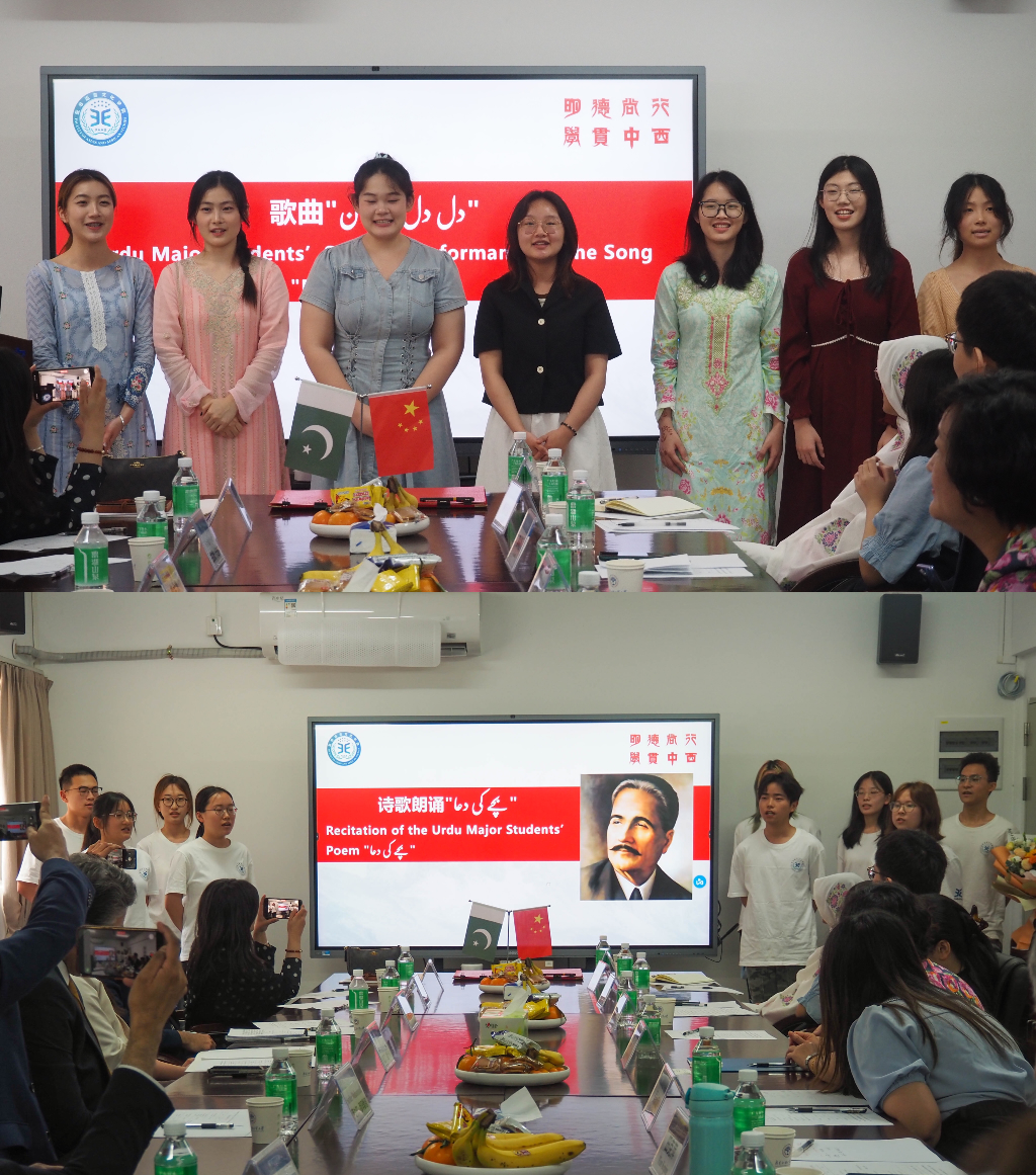 在交流展示中,乌尔都语专业的员工们身着巴基斯坦传统服饰,向来宾表演了乌尔都语歌曲合唱和诗朗诵,展示了他们对巴基斯坦语言和文化学习的成果和热爱。乌尔都语专业学子的风采得到了大使一行的充分赞扬与认可。