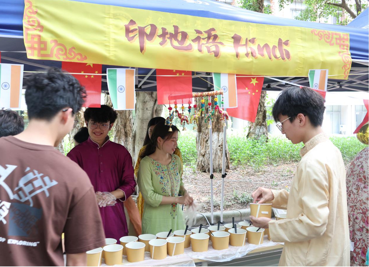美食集市上,各语系员工身穿对象国的特色服饰,在摊位上精心准备对象国的经典美食,吸引来客前来品尝。有来自阿拉伯的沙瓦玛卷饼,伊朗的藏红花鸡汤,朝鲜族的辣炒年糕,坦桑尼亚的羊肉抓饭,土耳其的米布丁,巴基斯坦的灌汤脆球,希伯来语的法拉费丸子,印度的咖喱料理,孟加拉国的特色小吃拼盘等不同地域的美食。此外本次文化节还联合了中国文化摊位,共同欣赏中文书法,感受中华美食。不同的美食风味营造出文化碰撞的愉悦氛围,参与者沉浸在多元文化之中,领略不同文化的魅力。